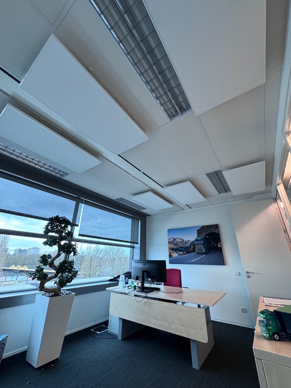 Om de geluidsoverlast en het doorslaan van gesprekken naar de andere ruimtes te beperken, is gekozen voor gerichte akoestische maatregelen. In de betreffende ruimte zijn akoestische plafondpanelen met een hoge absorptiewaarde (αw) toegepast, aangevuld met een akoestisch fotopaneel aan de wand. Door deze combinatie is de nagalmtijd in de ruimte aanzienlijk verkort, waardoor geluid sneller wordt geabsorbeerd en gesprekken minder ver dragen. De aanpak richtte zich bewust op de specifieke ruimte, waardoor gerichte verbeteringen konden worden doorgevoerd zonder aanpassingen in de overige ruimtes.